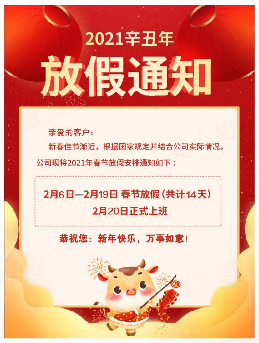 2021年鑫人達(dá)放假時(shí)間:2月6日-2月19日,共14天,2月20日正式上班;預(yù)祝大家新春愉快,萬事如意!